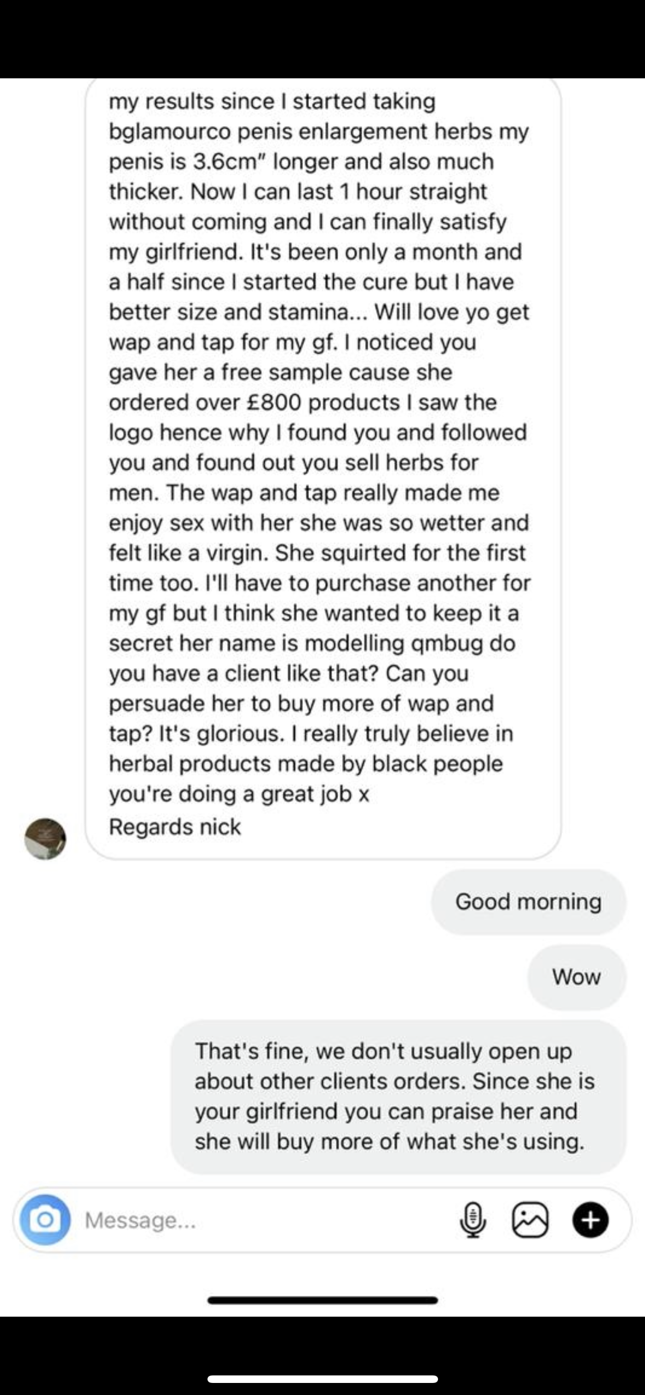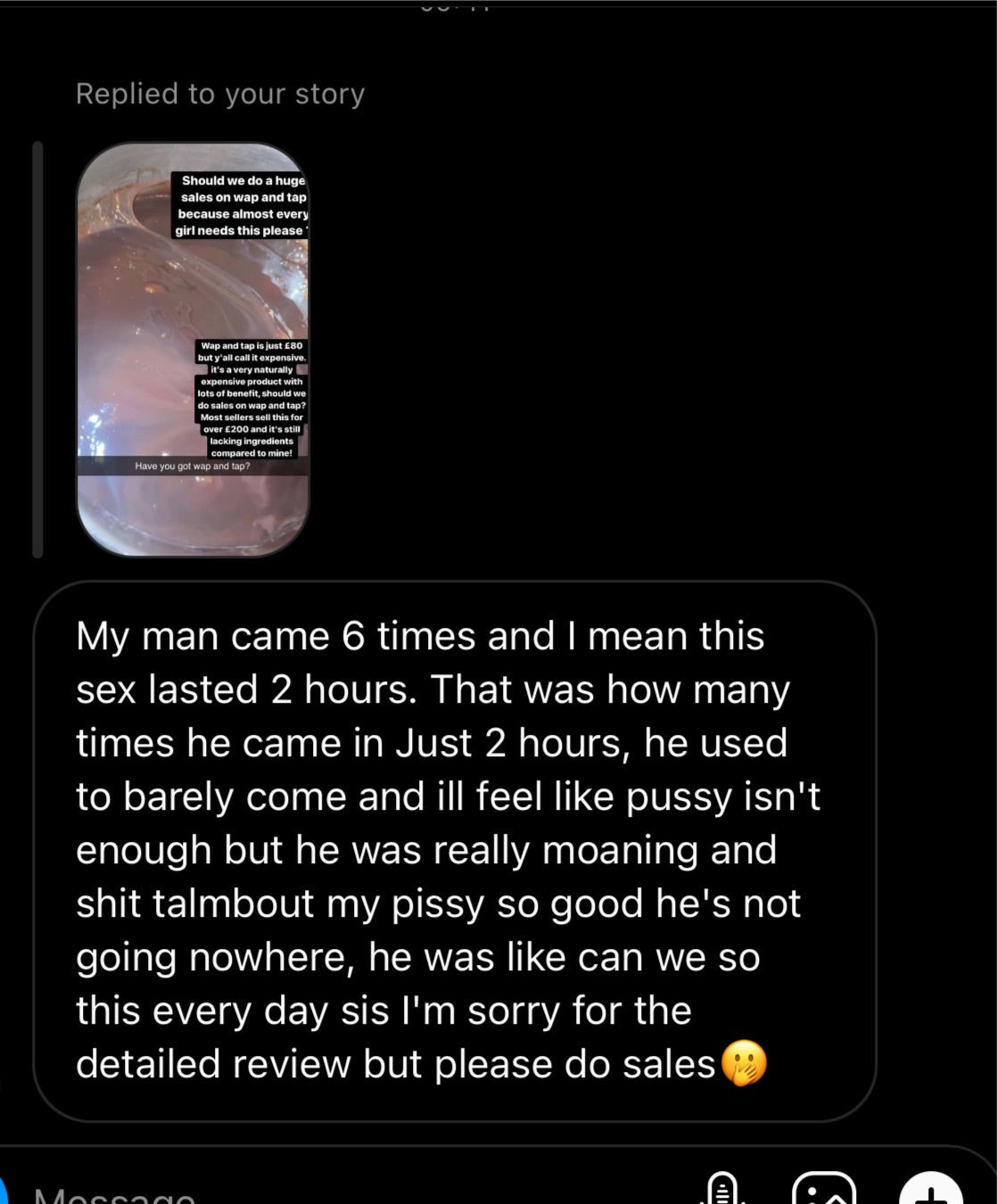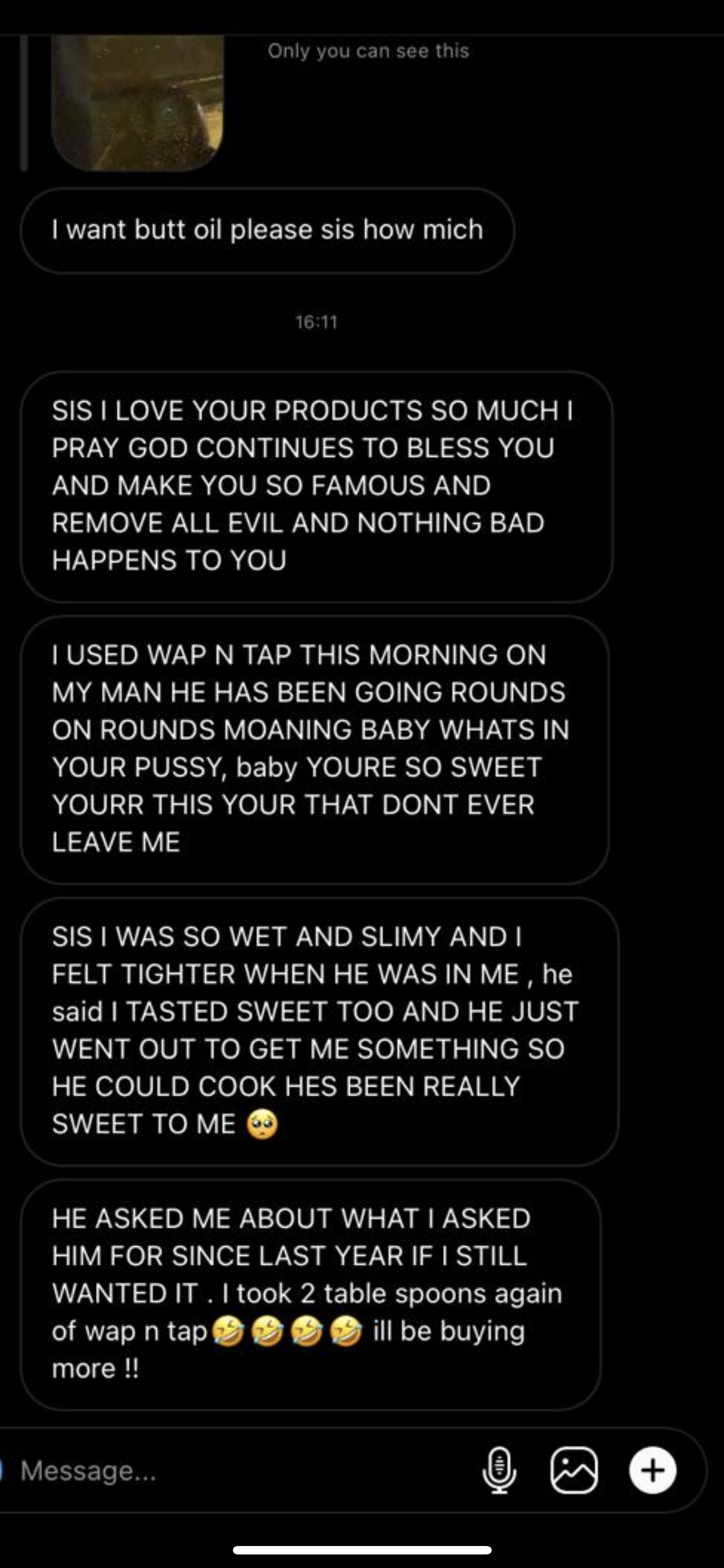 Wap n tap is an aphrodisiac, made with so many herbal products you might think it’s even more than herbal ingredients itself! goes straight down to your v. makes him very crazy over you and crave you more cause it makes you extra slimy wetter and tighter than you have ever been and sparks up your relationship. Keeps His Memory ADDICTED Down There and to you ...Makes it WARM, JUICY, GRIPPING, DRIPPING, SWEET & IRRESISTIBLE...!